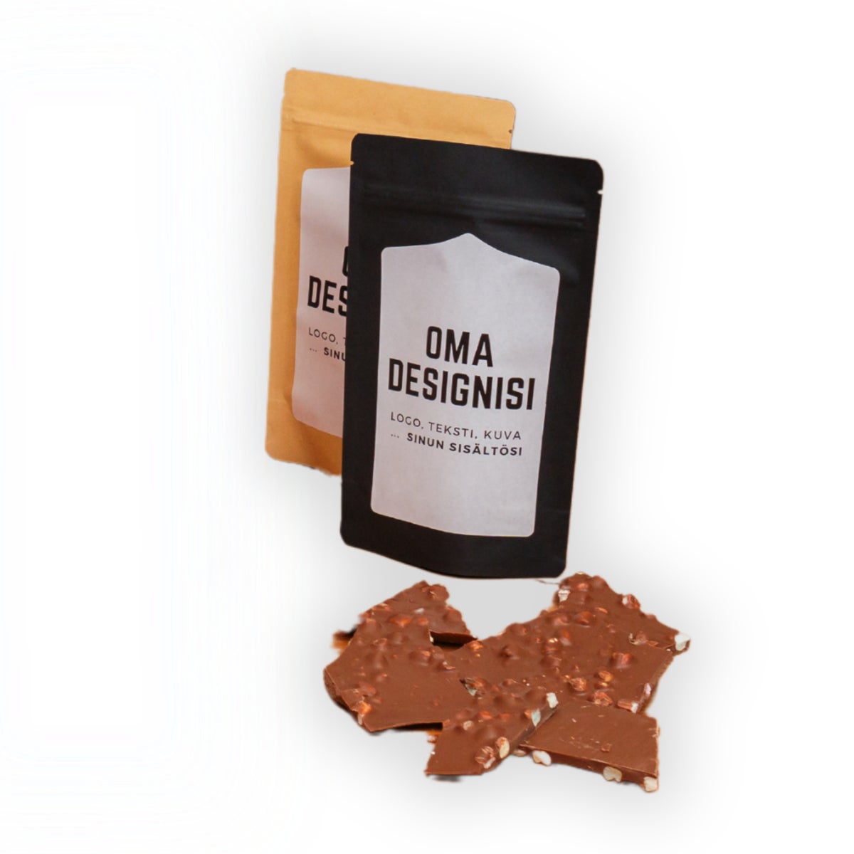 - Hinta sisältää kaiken tarvittavan: suklaan, pakkausilmeen suunnittelun materiaalinne pohjalta sekä painataustyöt.